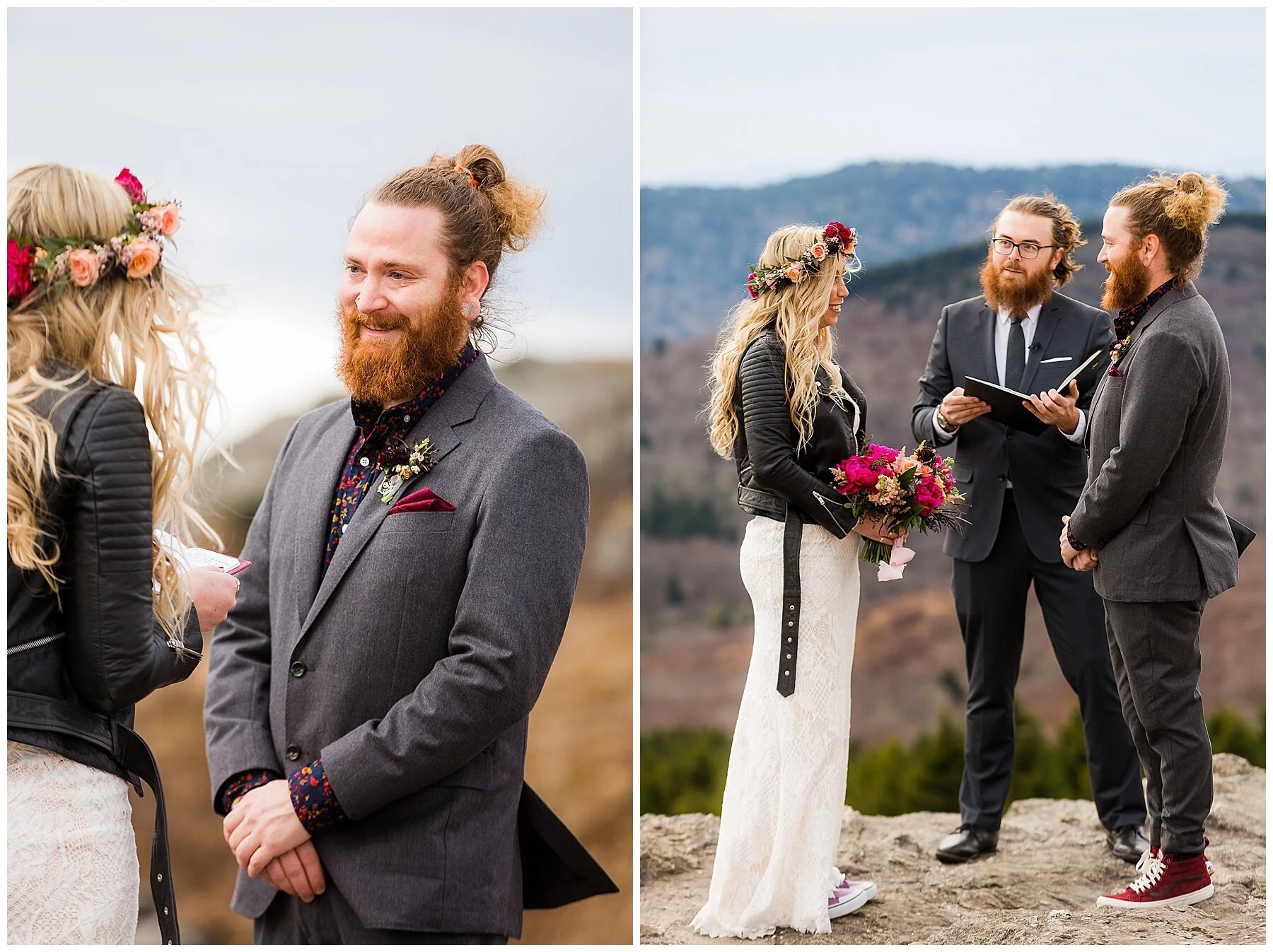 Fast forward to their elopement at Black Balsam Knob! With captivating vows and edgy details, they chose to elope in the Appalachian Mountains because as they put it: “We feel like our best selves when we're in nature. Some of our best moments together when we first started dating were exploring a mostly isolated Iceland, so an adventure elopement really spoke to us when the idea came up. The local night life of Asheville and the serenity of the mountains match our personalities perfectly. Also it is not too far from Savannah!”